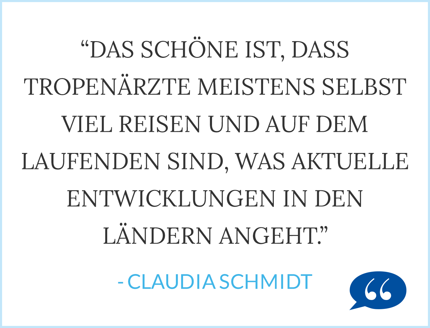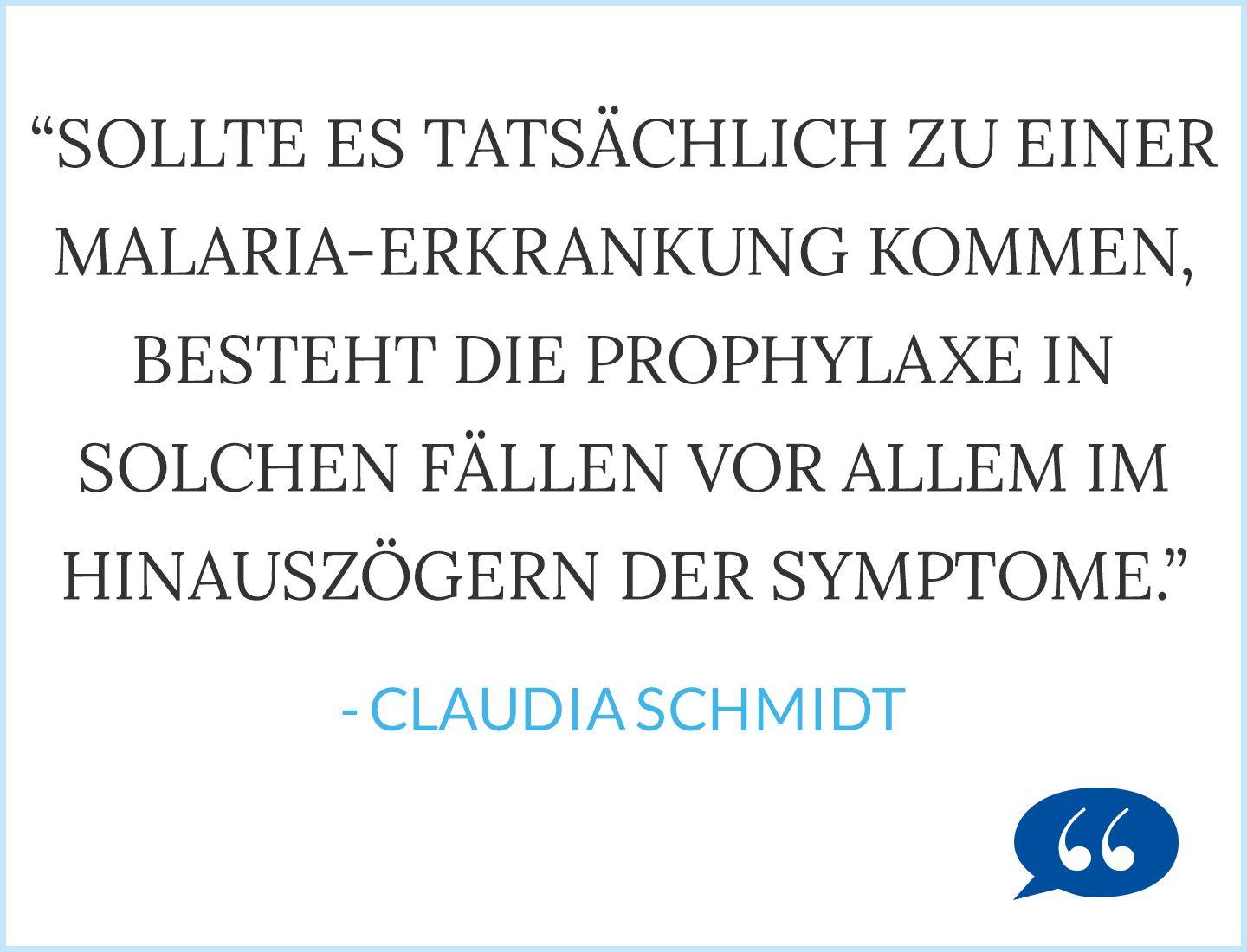 Gerade weil die Krankheiten nur schwer auseinanderzuhalten sind, hat Claudia in Malaria-Risikogebieten immer ein Standby-Medikament dabei. Wenn sie Fieber-Symptome hat und nicht ausschließen kann, dass es sich um Malaria handelt, kann sie so vorbeugen. „Aber man kommt natürlich nicht drumherum, zum Arzt zu gehen“, so Claudia. „Nur über die Blutuntersuchung kann man eine zuverlässige Diagnose stellen und dann auch die richtige Behandlungsmethode festlegen. Schließlich hat auch Malaria mehrere unterschiedliche Stämme.“