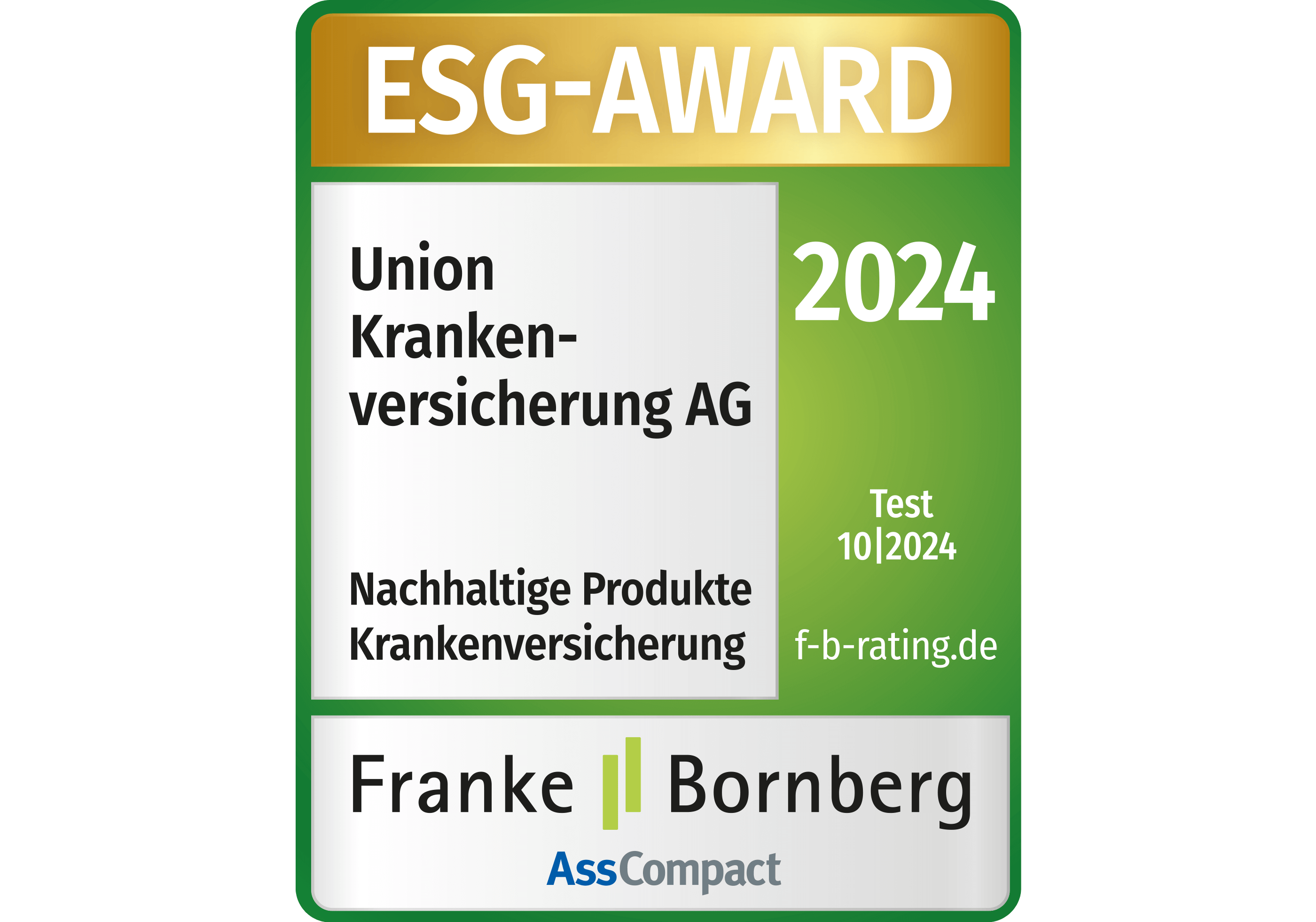 2024: Die Union Krankenversicherung wird in der Kategorie Krankenversicherung – Produkte mit dem ESG-Award von Franke und Bornberg ausgezeichnet. Gewürdigt werden eine konsequente Ausrichtung, die über reine Leistungszusagen hinaus geht und gleichzeitig positive Einflüsse auf die finanzielle Stabilität und Kundenzufriedenheit erkennen lässt.